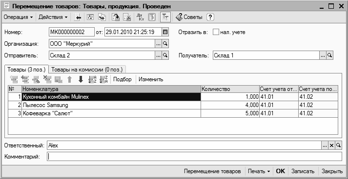 Одной из распространенных операций складского учета является операция по внутреннему перемещению товарно-материальных ценностей внутри предприятия. В этом случае перемещаемые ценности не покидают пределы предприятия, а лишь поступают из одного структурного подразделения в другое. Например, на производственном предприятии сырье и материалы могут передаваться со склада материалов на производственный склад, на торговой фирме товары передаются с центрального склада на склад конкретной торговой точки и т. д.