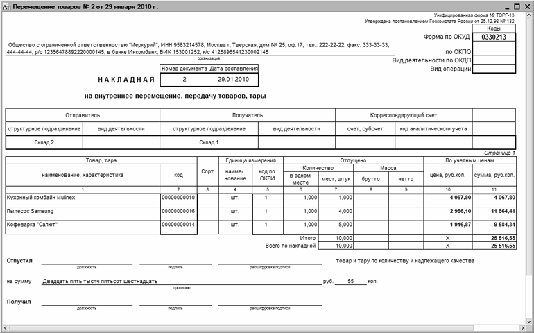 Рис. 8.9. Накладная на внутреннее перемещение по форме «ТОРГ-13»