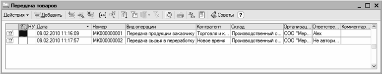 Рис. 9.10. Список документов «Передача товаров»
