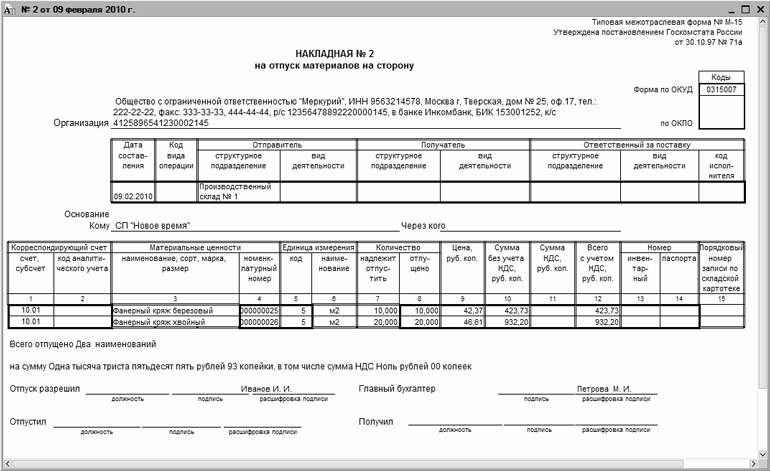 Рис. 9.14. Накладная на отпуск материалов на сторону