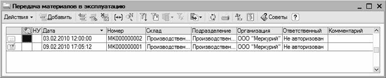 Помимо традиционных параметров (дата и номер документа, название организации и др.), в этом окне для каждого документа отображается название склада, с которого списываются передаваемые в эксплуатацию ценности, и наименование структурного подразделения предприятия, на баланс которого они передаются.