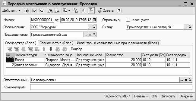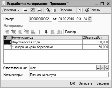Порядок работы в этом окне несложен. Номер и дата формируются автоматически в момент записи документа, а в табличной части составляется список материалов с указанием объема выпущенной продукции (работ, услуг), на производство которой были затрачены эти материалы. В полях Ответственный и Комментарий вводятся, соответственно, имя пользователя программы, ответственного за составление документа, и произвольный комментарий.