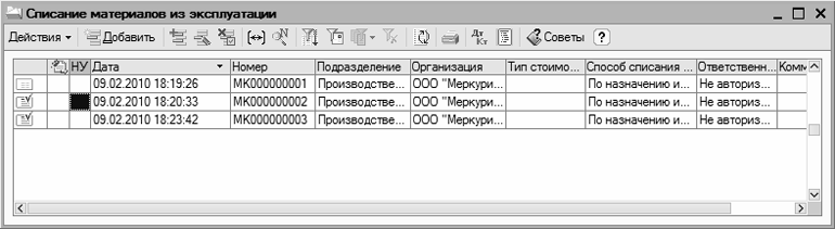 Рис. 9.21. Список документов на списание ценностей из эксплуатации