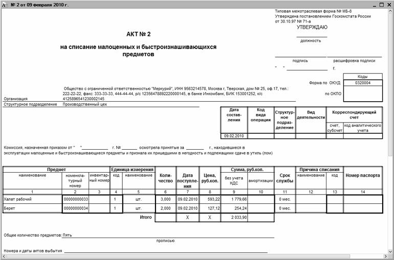Рис. 9.23. Печатная форма акта на списание ценностей