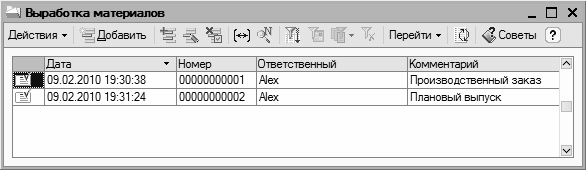 Рис. 9.24. Список документов «Выработка материалов»