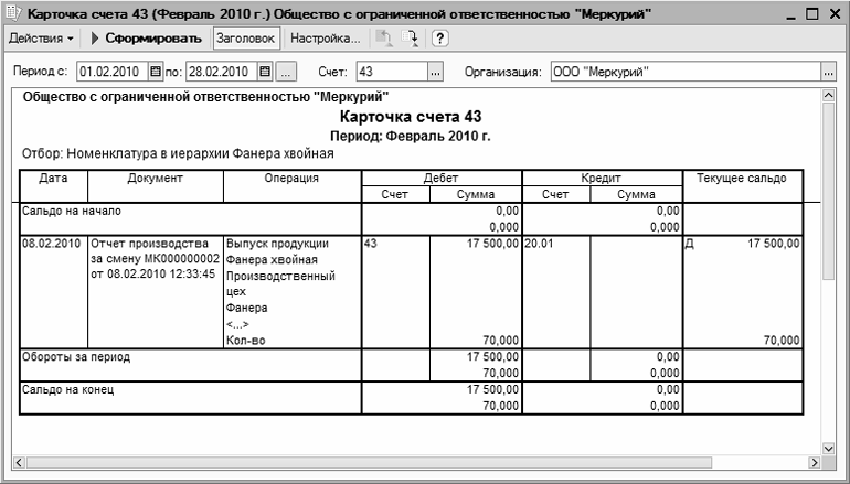 На рисунке показана карточка счета 43 по готовой продукции Фанера хвойная. Этот отчет был получен после двойного щелчка мышью на соответствующей позиции оборотно-сальдовой ведомости по счету 43 (см. рис. 9.30).