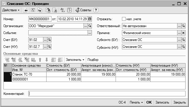 Рис. 10.20. Результат проведения документа на списание основных средств