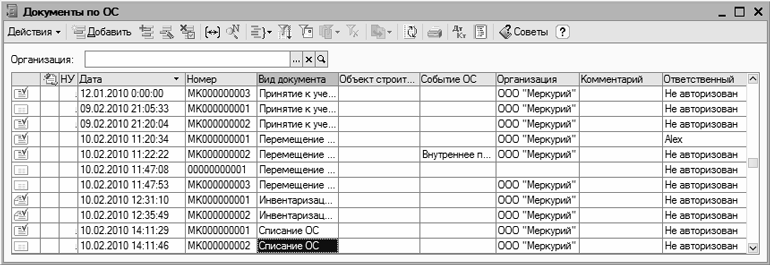 В окне представлены все основные документы по учету основных средств. Для каждой позиции списка в соответствующих колонках последовательно отображается следующая информация (набор отображаемых данных может зависеть от конкретного документа):