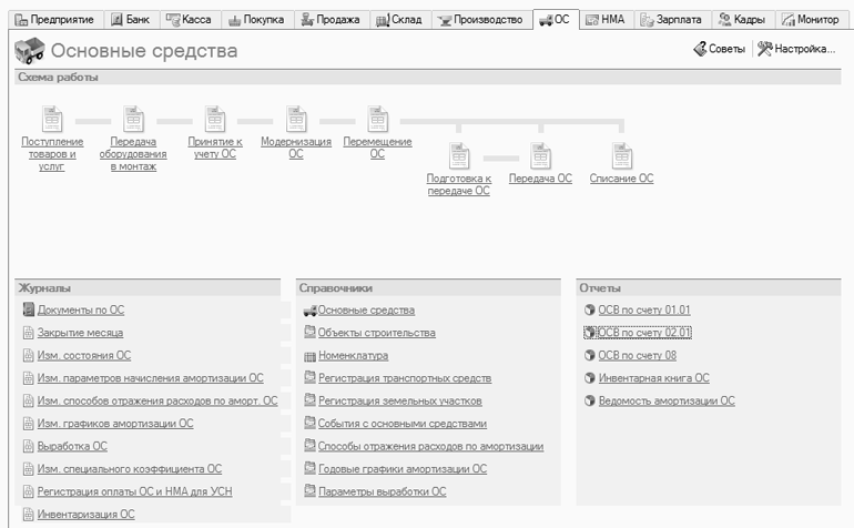 Для быстрого формирования отчетности по основным средствам на вкладке ОС панели функций имеются соответствующие ссылки (рис. 10.28).