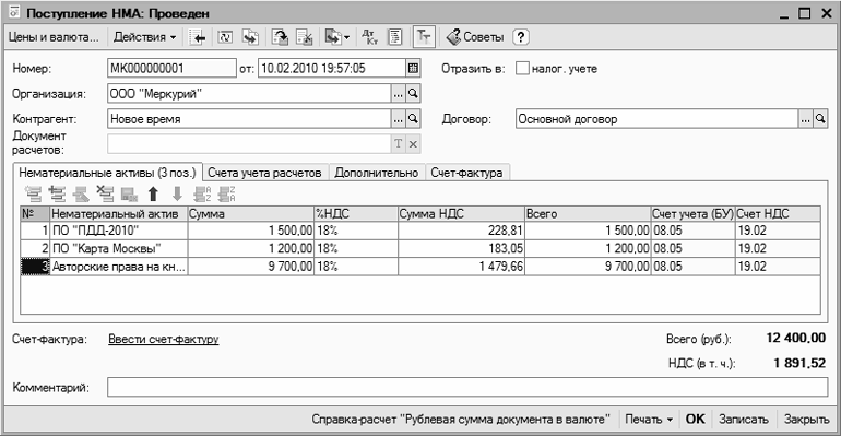 Рис. 11.2. Ввод и редактирование документа на поступление нематериальных активов
