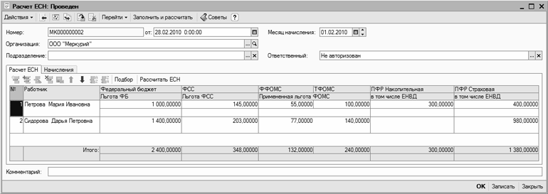 Рис. 12.9. Ввод и редактирование документа «Расчет ЕСН»