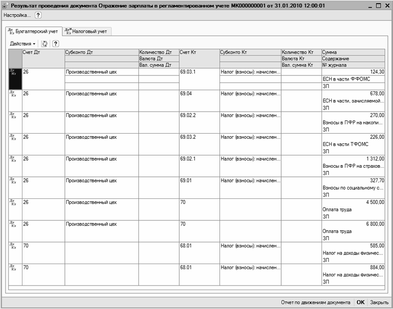 На этом рисунке показаны проводки, сформированные в бухгалтерском учете. Чтобы посмотреть проводки налогового учета, нужно переключиться на соответствующую вкладку.