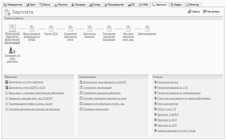 Для быстрого формирования отчетности по зарплате на вкладке Зарплата панели функций имеются соответствующие ссылки (рис. 12.13).