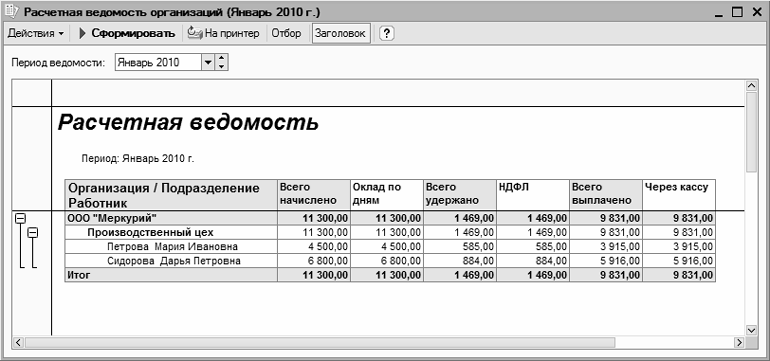 Чтобы сформировать расчетную ведомость в произвольной форме, нужно щелкнуть на ссылке Расчетная ведомость (произвольная), затем в открывшемся окне указать отчетный месяц и нажать кнопку Сформировать. Пример расчетной ведомости показан на рис. 12.15.
