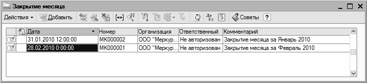 Рис. 13.1. Список документов «Закрытие месяца»
