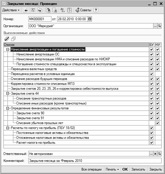 Чтобы выполнить закрытие месяца, нажмите в данном окне кнопку ОК или выполните команду Действия | Провести.