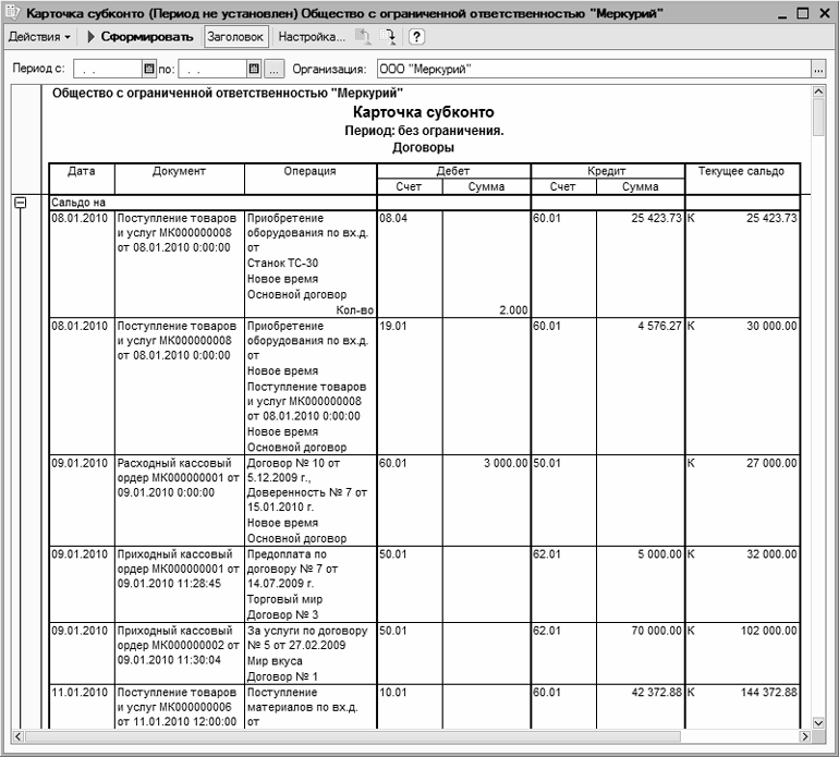 В программе есть еще один похожий отчет – карточка субконто, который выглядит примерно так же, как и карточка счета, только привязан не к счету бухгалтерского учета, а к субконто.