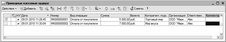 Рис. 4.1. Окно списка приходных кассовых ордеров