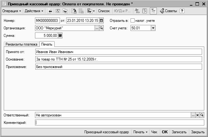 Рис. 4.4. Ввод и редактирование приходного кассового ордера, вкладка Печать