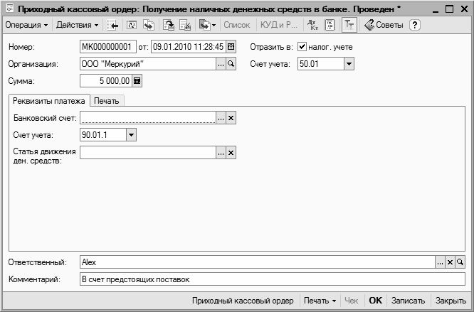 Рис. 4.7. Приходный кассовый ордер для операции Получение наличных денежных средств в банке