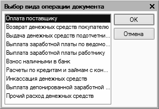 Рис. 4.9. Выбор вида операции для расходного кассового ордера