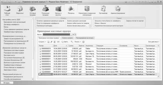 В центральной части главного окна программы отображается содержимое текущего режима работы. Например, если в панели навигации раздела Финансы щелкнуть на ссылке Приходные кассовые ордера, то в центральной части интерфейса отобразится список сформированных ранее приходных кассовых ордеров (см. рис. 1.2). Если же вы хотите, чтобы содержимое текущего режима работы отображалось в отдельном окне – щелкните мышью на соответствующей ссылке, удерживая нажатой клавишу Shift.