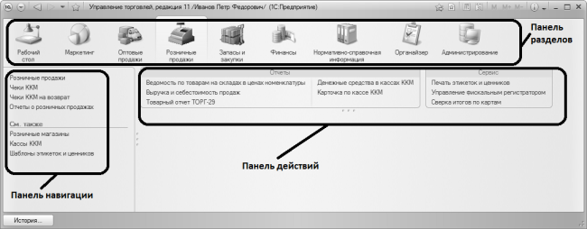 В каждом разделе имеется своя панель навигации и панель действий. С помощью панели навигации осуществляется выбор требуемых режимов работы и активизация соответствующих функций программы, а панель действий предназначена главным образом для формирования отчетности и перехода к некоторым сервисным функциям программы. Панель навигации расположена в левой части раздела, а панель действий – вверху, сразу под ссылками панели навигации. На рис. 1.3 показаны все панели интерфейса программы (в данном случае открыт раздел Розничные продажи).