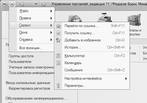 Таковы основные этапы работы с программой «1С Управление торговлей 8.2». Однако стоит вкратце упомянуть и о сервисных функциях, которые предназначены для блокировки информационной базы, удаления помеченных объектов, работы со списком пользователей, формирования журнала регистрации системных событий, а также для выполнения целого ряда иных операций. Доступ к ним осуществляется с помощью соответствующих команд главного меню (они объединены в подменю Сервис), а также из раздела Администрирование.