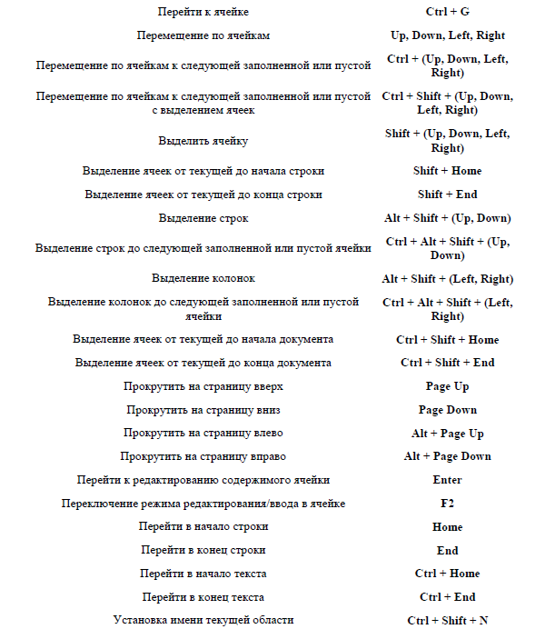 «Горячие клавиши», предназначенные для работы с табличными документами