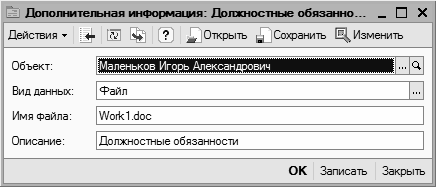 В поле Имя файла с клавиатуры вводится имя файла с данными (рекомендуется указывать полный путь к файлу), а в поле Описание – краткое описание хранящейся о физическом лице информации (например, Заявка кандидата, План испытательного срока, Отчет о работе и т.д.).
