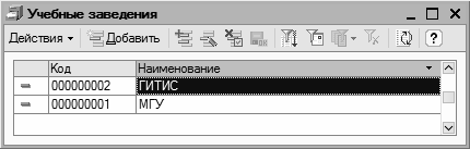 Работа со справочником ведется непосредственно в окне списка. Для ввода нового учебного заведения предназначена команда Действия▸Добавить, для редактирования текущего – команда Действия▸Изменить (также для этого можно воспользоваться соответствующими кнопками инструментальной панели).