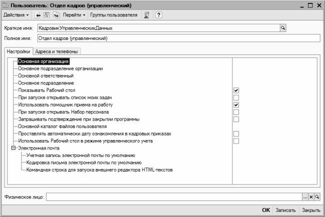 В нижней части окна выполняется настройка параметров, которая будет актуальна для данного пользователя.