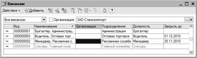 Возможности программы предусматривают отбор списка вакансий по виду – для этого следует в списке, расположенном под меню Действия, выбрать значение Открытые вакансии или Закрытые вакансии. Данный механизм особенно удобен при наличии большого числа позиций в списке. Если же этому параметру присвоено значение Все вакансии, то перечень будет включать в себя все вакансии, имеющиеся в конфигурации.