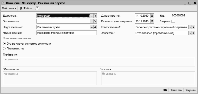 Чтобы сохранить введенные данные о вакансии, нажмите в окне редактирования кнопку ОК или Записать. Кнопка Закрыть предназначена для выхода из данного режима без сохранения выполненных изменений.