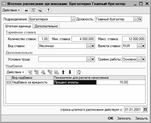 В нижней части вкладки можно сформировать перечень надбавок для данной штатной единицы. В данном случае надбавка – это дополнительное денежное вознаграждение (выплата), которое выплачивается сверх ставки. Надбавки могут выплачиваться в разных случаях: например, в виде премии за получение выдающихся результатов, в виде дополнительных выплат за вредные условия труда и др.