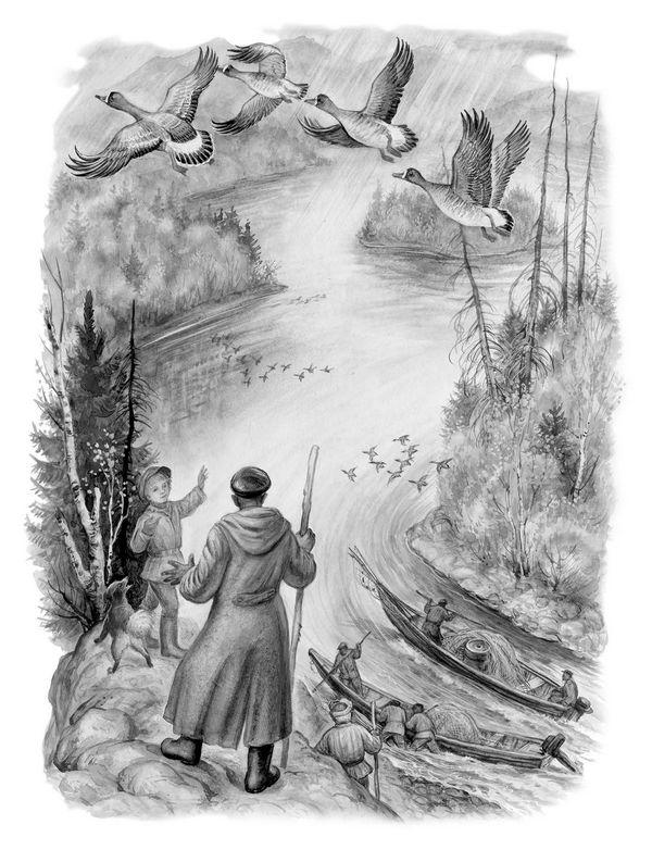 После этого Захар долго молчал. Сидел он на опрокинутой лодке и молчал. Над Енисеем торопко проносились стаи уток, куликов. Кружились и вскрикивали чайки. Начинался осенний перелёт. Птицы отлетали на юг, в тёплые края, замыкая свой ежегодный великий путь.