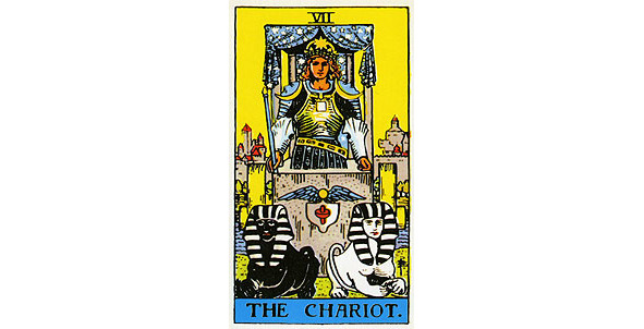 Это триумфальна колесница, на которой победитель возвращается на родину. Но суть не столько в победе, или возвращении, а в движении. Колесница едет к свой цели и никогда не сворачивает, никогда не останавливается. Это предельно собранное стремление вперед. Колесница движется к цели и никому лучше не вставать у нее на пути, все подчинено этому движению. И это не просто крестьянская телега с огурцами и картошкой – это Триумфальная колесница, это момент торжества и достижения. Колесницу влекут не банальные кони, хотя и это возможно во многих колодах. Но в символизм гораздо интереснее и глубже в тех колодах, в которых в Колесницу запряжены Сфинксы.