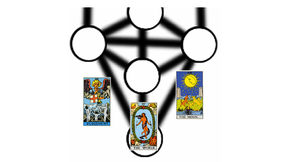 Пути Шин и Коф идут в разные стороны от Малкут. Суд – самостоятельный выбор, смена ситуации, решительный шаг на встречу переменам. Луна – остановка, застой, не способность выбраться и сделать это решительный шаг. Та же ситуация, что и в Арканах Дурак и Маг – два противоположных пути, два разных способа действия, исходящие из одной точки.