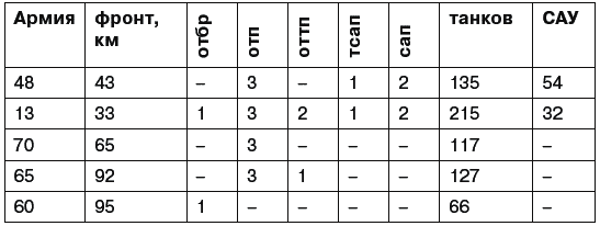 Для обороны остального участка фронта протяжением свыше 200 км командующий фронтом выделил только семнадцать стрелковых дивизий и четыре стрелковые бригады. Его занимали левофланговый корпус 70-й армии в составе трех дивизий, 65-я армия, состоявшая из девяти стрелковых дивизий и одной стрелковой бригады, и 60-я армия в составе пяти стрелковых дивизий и трех стрелковых бригад. Левофланговый корпус 70-й армии на своем участке протяжением 38 км развернул на главной полосе обороны две дивизии и на второй полосе обороны – одну дивизию. Войсками 65-й армии генерал-лейтенанта П.И. Батова и 60-й армии генерал-лейтенанта И.Д. Черняховского была занята только главная полоса обороны. Для этого были задействованы 2/3 сил этих армий – девять стрелковых дивизий и три стрелковые бригады. Остальные стрелковые соединения (пять дивизий и одна бригада) располагались вблизи от второй полосы обороны, составляя второй эшелон стрелковых корпусов и армейский резерв.