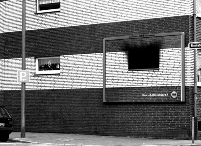 Как подтолкнуть жильцов многоэтажки к страхованию своих хорóм? Роль осколков стекла теперь исполняют чернота и копоть сгоревшей квартиры. Для этого в наружной рекламе пришлось специально имитировать окно и часть кирпичной стены (рис. 25).