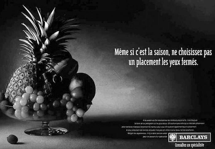 Приглядитесь к картинке внимательнее (рис. 29). В вазе с тропическими фруктами прячется совершенно несъедобная граната. «Даже если за окном жаркое лето, не стоит размещать свои активы с закрытыми глазами» – гласит заголовок. И финальный аккорд рекламы: «Проконсультируйтесь со специалистом из нашего банка».