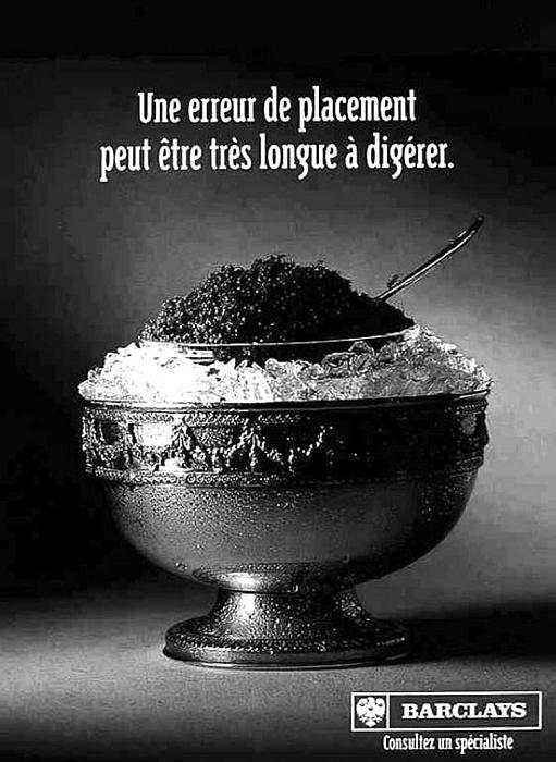 Ну, и последний пример в этой серии (рис. 33). Надпись на объявлении сигналит: «Для того чтобы переварить ошибки в размещении финансовых средств, может потребоваться много времени». Свежайшая чёрная икра прекрасно сервирована. Идеально выдержан температурный режим. Но вот беда – аппетит портят муравьи, которые проложили свой путь прямо по деликатесному продукту.