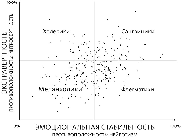 Присмотревшись внимательно, можно заметить, что в классификации Галена мы имеем дело с двумя осями: социальной активностью и эмоциональной стабильностью. Вместе они демонстрируют самую простую двухфакторную модель личности, которой до сих пор иногда пользуются профессиональные психологи и психометристы.