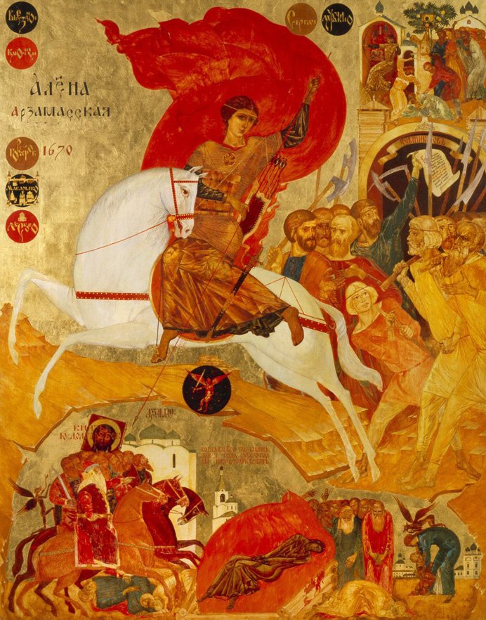 Алена Арзамасская названа так по месту своего рождения – Арзамасской Выездной Слободе. Иногда к ее прозванию прибавляется эпитет «Темниковская», так как ключевые этапы ее деятельности прошли в городе Темникове (совр. Мордовия). История Алены Арзамасской уникальна. Женщина, оставившая монашество ради борьбы с угнетателями, руководившая многотысячным отрядом повстанцев и взошедшая на костер, заслужила у исследователей звание «русской Жанны дꞌАрк».[227]227