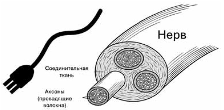 Слуховой нерв посылает нервные импульсы в мозг. Он соединяет волосковые клетки улитки с головным мозгом и подобен электрическому кабелю: содержит тысячи отдельных «проводов» (нервных волокон). Наша слуховая информация поступает в мозг через слуховой нерв точно так же, как вся информация с микрофона передается по кабелю (см. рис. 10).