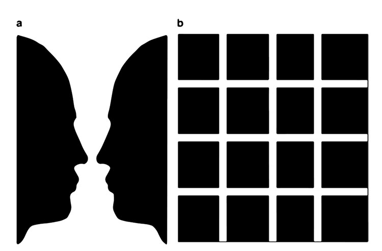 Говоря про восприятие шума в ушах, я приведу вам визуальные аналогии. Например, возьмем вазу Рубина (а), чтобы продемонстрировать концепцию «фигурного грунта». Шум в ушах можно рассматривать как слуховой объект, выделяющийся на общем фоне (см. рис. 12).