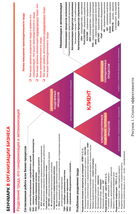 • Углубление уровня разделения труда. Чем выше специализация труда, тем выше его эффективность. Чем глубже разделены потоки создания ценности и их процессы, тем выше операционная эффективность.