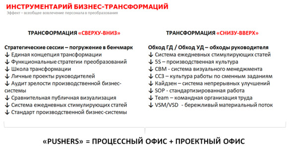 Реализация трёх столпов операционной эффективности требует повсеместной кардинальной трансформации текущей бизнес-архитектуры предприятия: как цепочек создания стоимости, так и бизнес-процессов и функций. А повсеместная трансформация требует всеобщего вовлечения персонала в преобразования.