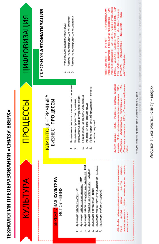 Целесообразно трансформацию «снизу – вверх» начинать параллельно с трансформацией «сверху – вниз». Тем самым, к моменту развёртывания стратегии трансформации на уровне исполнения, последний будет к этому максимально готов. Через трансформацию «снизу – вверх» создаётся отличный базис для трансформации бизнеса в целом, рисунок 3.