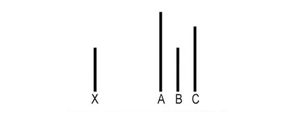 В 1951 году доктор психологических наук Соломон Аш провел эксперимент. Ученый хотел выяснить, как мнение окружающих может влиять на искажение восприятия действительности. Или, говоря простым языком, как мнение большинства вкупе с социальным давлением могут убедить человека в чем угодно – даже в том, что логически не может быть правильным. В результате эксперимента из 50 испытуемых более 15, услышав от подставной группы из 7 человек неправильный ответ на вопрос, повторяли за ними. И это было абсурдно, потому что вопрос был такой: «Назовите линию, которая равна по длине линии Х» (см. фото).